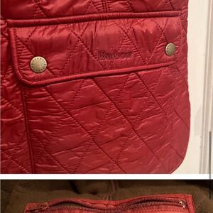 A vibrant red quilted vest by Barbour, featuring a diamond-shaped quilting pattern and a stand-up collar for added warmth.