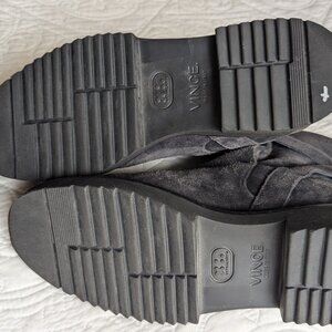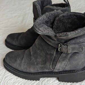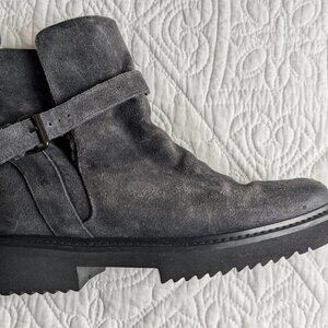 These Vince Suede short boots are lined with super soft authentic Shearling fur for optimum warmth !! They are Made in Italy and and have a nice "distressed" gray blue hue..They have a side buckle which allows for enlarging the opening and the toungue of the boot can fold down..They have a thick black rubber lug sole for excellent comfort and durability. They would look great with any outfit, jeans or a skirt with tights... an all around great pair of stylish short boots by a great design firm. Size 6 (eur 36) Never worn. If you are looking for a winter boot or ankle bootie, this would be a great addition to any wardrobe. Not as edgy as a moto boot but has tons of style! Vince boots are known for their craftsmanship and the current short styles with shearling are priced from $ 395-595 !!