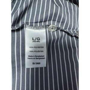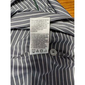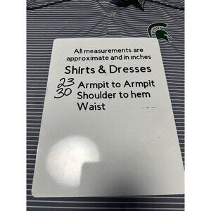 This Russell Golf Polo Shirt is a stylish choice for any golf enthusiast. It features a gray and white stripe design with the Spartan MSU logo prominently displayed. This men's size L shirt ensures a comfortable and athletic fit. Small hole at the back of the collar from