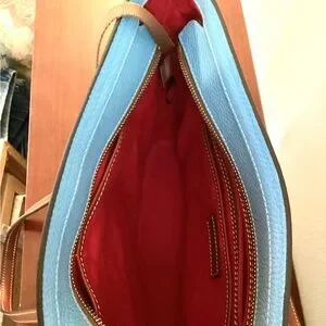 Beautiful blue pebbled leather handbag with brown straps and trim.