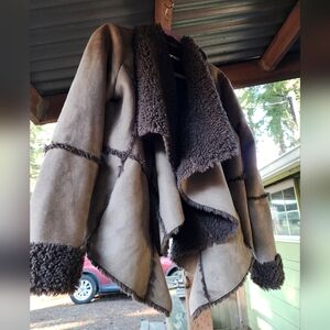 Grey and brown shepra style jacket. Super cozy and warm! Has a button you can use for extra swaddled cozyness, or leave open for a different look. The fuzzy is very nice and soft, and the jacket is in great condition. It's medium but will also fit a size small.