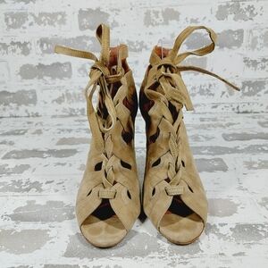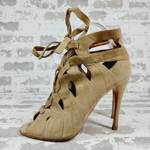 Alaia Beige Cut Out Suede Lace Up Peep Toe Heeled Ankle Booties M817
