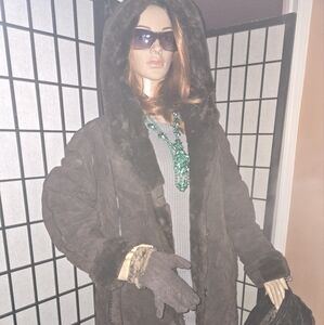 Showstopping women's luxury, suede, hooded winter coat, with embroidered piping design, with pockets, & has Shetland interior making this fashionable coat very thick & warm; EXCELLENT condition, NWOT; color: rich chocolate; size: Large.
