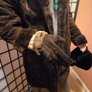In the photos are also a pair of medium-sized brown gloves w/faux fur lining, and also a matching hat. If you are interested in these 2 accessories, pls let me know; I'll quote you a price.