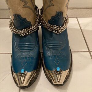 In very good condition, never worn....Only some very light scratches du to the storage...One of the two metal tips has been repaired with a larger nail, see the last photos. ...Made by Justin boots.....