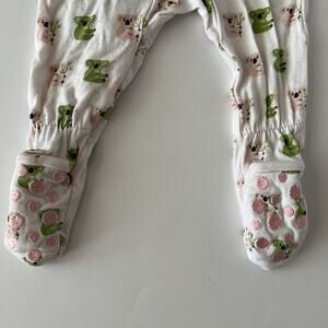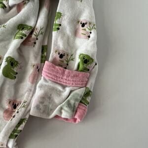 Sweet green and pink koala print bamboo footed sleeper from Kickee Pants. Size 0-3m. GUC for light wash wear, pilling as shown. Can't tell if fabric inside of top snap looks faintly yellow? I have two of these.