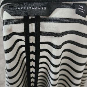 This Investments Women's Striped Blazer in size 14 features a classic fit with a regular length and long sleeves, making it suitable for various occasions such as parties, casual outings, or business settings. The black and ivory striped pattern adds a stylish touch to the blazer, which is made from a blend of polyester, spandex, and rayon materials for comfort and durability.