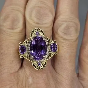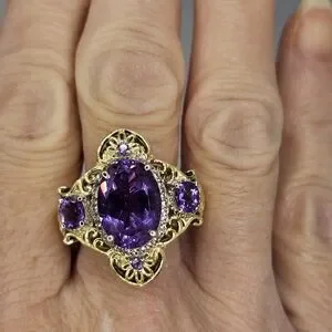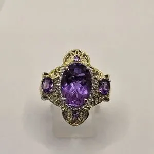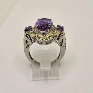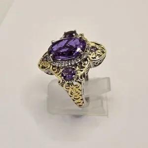 This is one special ring. The setting is solid sterling silver with platinum overlay and yellow gold framing. The large gemstone is amethyst, and the other stones are alexite. Alexite is a lab grown gemstone that changes color in certain lighting. It is named after the famous alexandrite. This will make anyone feel like a member of the royal family. Size 8. Hallmarked STS 925!
