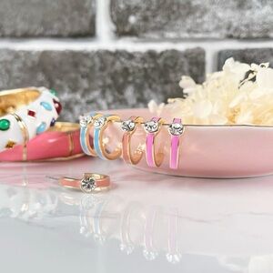 Meet your new favorite summer hoops, Remi. These cute hoops include three pairs. Each hoop is hand-painted in enamel of salmon, pink, and sky blue colors. The Remi Hoops are also adorned with a micro-crystal. These will be a summer staple in your wardrobe this season. 3/4” in diameter.
