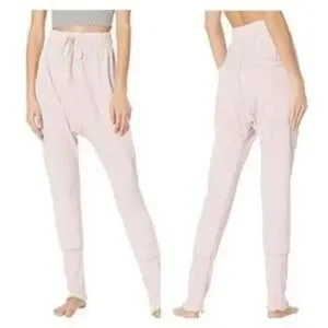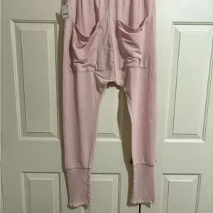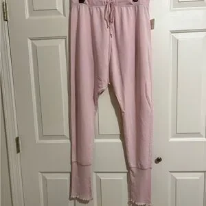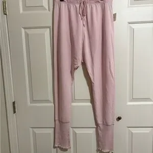 Slouchy/Harlem style joggers with lettuce-edged rib-knit cuffs.