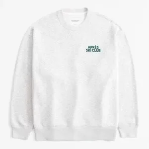 “Comfy sweatshirt in our Soft A&F MAX heavyweight fabric and legging-friendly length, featuring a relaxed chest width, ski destination-inspired graphic detail at chest, crew neckline and banded hem and cuffs. Body: 70% Cotton, 30% Polyester.