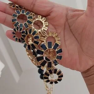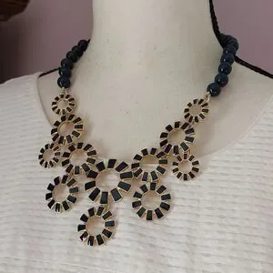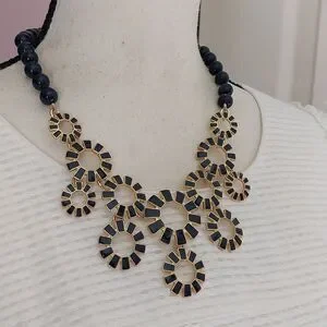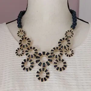Talbots Gold Tone and Navy Blue Enameled Sunburst and Beads Statement Necklace