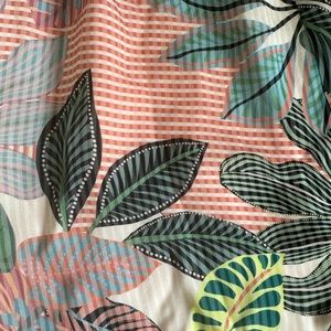 Super playful tropical print in peach, coral, pinks, greens, and blues.