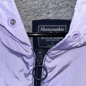 Abercrombie rain jacket zip up with hood, purple white, and navy. Lined interio