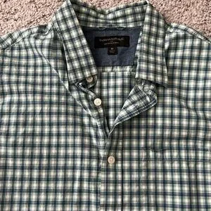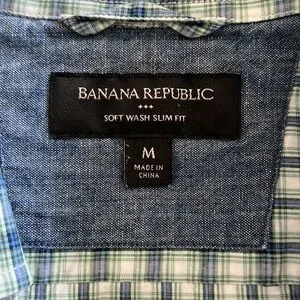 Excellent used condition blue and green plaid button down casual shirt from Banana Republic. Size medium. Fits true to size. Slim fit. No flaws found at all. In great condition. Husband stopped wearing it so needs a new home. Please feel free to ask any questions or make an offer. Thanks