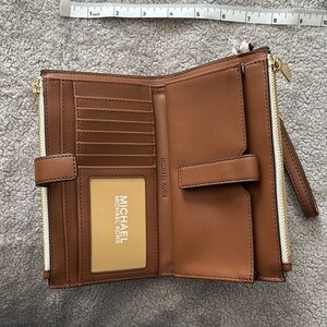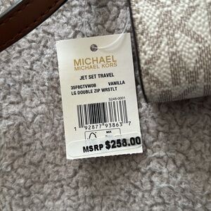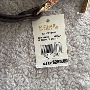Chic and versatile, this Michael Kors wristlet in beige is perfect for any occasion. Its compact design offers style and convenience, making it an essential accessory.