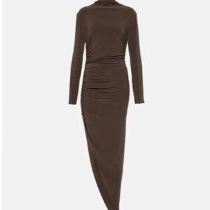 This Norma Kamali midi-length gown features a turtleneck, long sleeves, and shirred waist. Designed with comfortable stretch, the comfortable fit is complete with an asymmetric hem