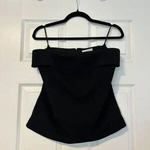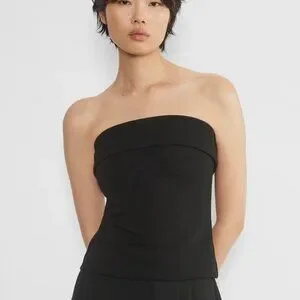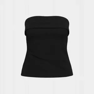 This is a lined tube top designed for a slim fit. It's cut from structured double-layer crepe with a touch of stretch for shape retention and hold. The clothing hanger strap on both sides are slightly damaged