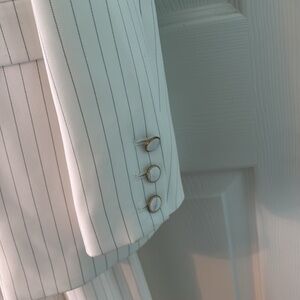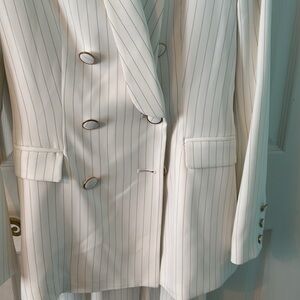 Marciano Guess white pinstripe suit. Double breasted med jacket. Wide leg small pants.