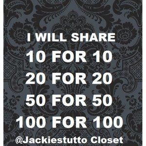 @jackiestutto Sharing 100 of your items again..... and soon I'll buy some things from your closet! Gotta get going here and make some sales first. But I've got my eye on a few things. Thanks so much!!