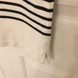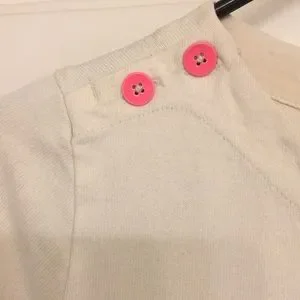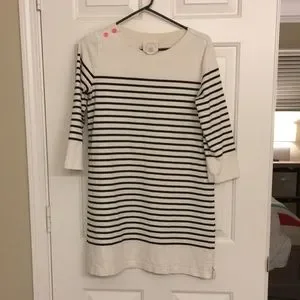 Adorable cream and navy blue shift dress in excellent condition. Features three quarter sleeves, nautical neck line, and accented with pink buttons. 100% cotton.