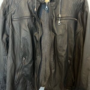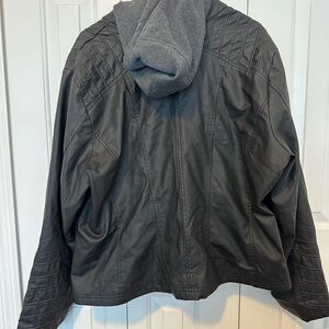 plus size, faux black leather jacket with attached gray hoodie lining. Size 2x (18-20). Great jacket. Excellent shape. No rips/tears/stains. Smoke free home. Brand: Maralyn & Me from Macy’s.
