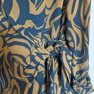 Beautiful Hawaiian print wrap dress with shoulder pads. Perfect for work or leisure. Long sleeve and wrap style flattering on anyone!