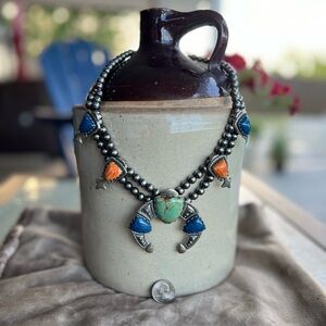 American West Jewelry. 925 sterling silver. Arrowhead squash blossom with green turquoise, orange spiny, and denim lapis gemstones. Brand new, never worn. Really beautiful. All genuine stones and Silver.