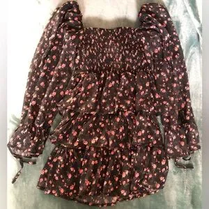 Floral corset dress, with ruffles and smocking on the back. Very similar to For Love and Lemons. Size Small, from 2 Bella Boutique.