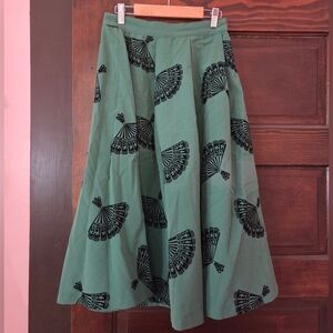 I love the look of this skirt but I have lots of questions. Material? Waist measurement and length. Is it lined? Any stretch? Are the little fans embroidered or a print? Thank you!