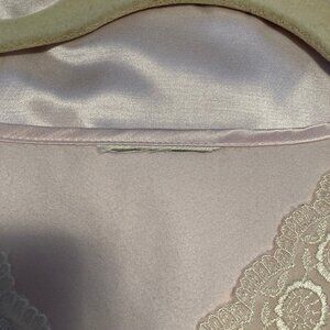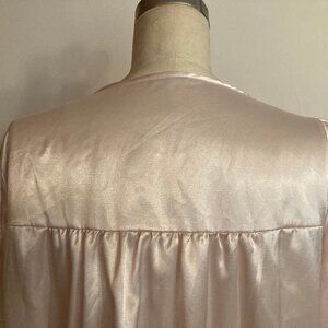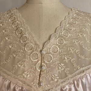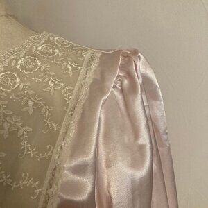 Vintage Satin and Lace nightgown in blush light pink. Beautiful lace detail with three pearly buttons at the top. Puff shoulders and long sleeve with stretchy bell cuffs. Satiny outside an super soft material against the skin. Measures 47" from shoulder to bottom hem. Measures about 18 1/2" pit to pit on the mannequin. Unsure of the maker since the tags have been removed. Excellent vintage condition! Measures about 17” give or take from shoulder to shoulder laying flat