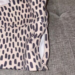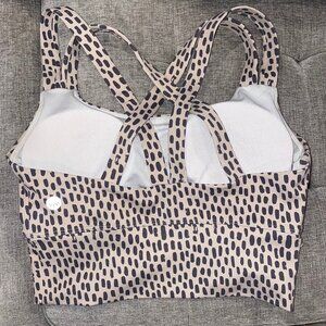 Excellent used condition, only worn and washed once. No flaws just not my style. So comfortable, has removable cups, criss-cross straps, and a hidden key pocket in the band. Perfect for low-medium workouts or just running errands and hanging out. So comfy!! Size S. Color is like a cream/beige with grayish spots. Happy to answer any questions!