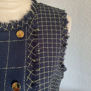 You’ll exude confidence when you wear this uniquely designed Julia Jordan professional sleeveless dress that will easily take you from office to after-hours events in style. Navy blue with gold window panes in an asymmetric pattern, accentuated with soft fringe at neck, arms and hem. Hidden back zip. The gold buttons in front create a classic look. Fully lined. Machine washable in 100% polyester.