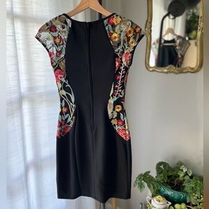 Pretty and unique bodycon dress by BCX. Mesh cap sleeves with floral embroidery. Embroidery extends down to the sides of the dress to give a curvy cutout look.
