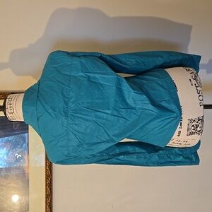 Reposhing this gorgeous jacket. I bought it without measurements and it's a bit too small for me. Fits more a medium. Asymmetrical, moto style jacket, very lightweight. Fun teal/ turquoise color. Large front, zippered pockets. 18.5 inches across the bust and approximately 21 inches long. Tag says size 42, to me, fits a medium or small if you layer underneath. M4