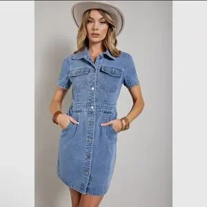 Stylish denim dress with button-up front. Features short sleeves and a flattering fit. Perfect for casual outings.