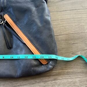 Christopher Kon Womens Bag Blue Leather Tan Brown Straps Slouchy. Large zipper pockets. Does not have cross body strap. See pictures for measurements