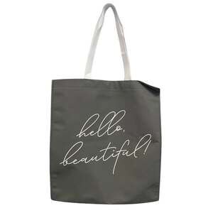 This bag was made by upcycling a new reusable tote bag with a I'm Not A Cool Mom I'm An Adam Sandler Mom quote on one side (to (mostly) cover up an old store logo) and the message "Hello Beautiful" on the other side. Bag measures approx 15" by 14" with an 8" strap drop. So cute!