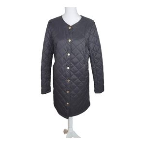 Liz Claiborne black quilted jacket with pockets. Gold snap closure. Collarless. Perfect for layering. Size M. Approximate measurements: length 35"; sleeves 25"; armpit to armpit 21". Very good condition. See photos for details.