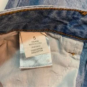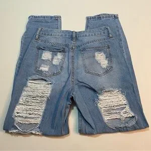 Medium wash distressed boyfriend jeans. Size 5 (I’m a size 27 and these fit comfortably). 100% cotton. Multiple distressed areas throughout. Like new condition