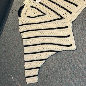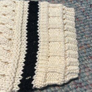 This is a GORGEOUS size large 100% cotton sweater by bichop+young. Is cream and black with dolman sleeves so PTP is hard to measurere. The bottom of the sweater is 3 inches higher in the middle and has a gradual slope to the corners. The stitching on the his sweater is amazing and the pattern is fabulous.