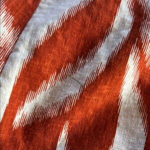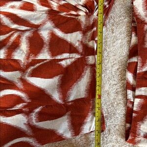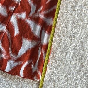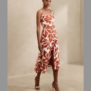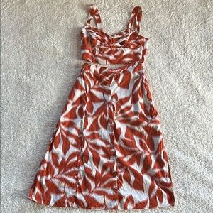 This beautiful two-piece set features a stunning rustic orange and white leaf floral design. The skirt has a chic side slit, and the crop top perfectly complements your figure. There is one small flaw in the back of a skirt, which you can see in the images, but otherwise, it’s flawless!