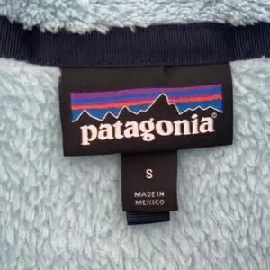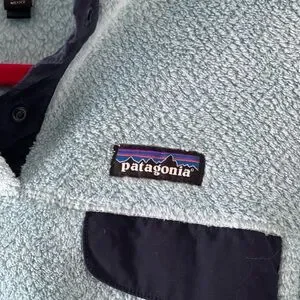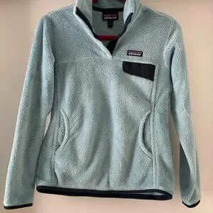 Soft fleece by Patagonia. Light blue color with a dark pocket accent. Ideal for layering.