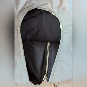 Lightly puffed, with black trim around the armholes. This vest is a dazzler when it's hit by light. 100% nylon, with poly lining and cotton fill. Review the neckline close-up pic for the areas where the reflective is worn away. Otherwise, this early 00 garment is in fantastic shape.