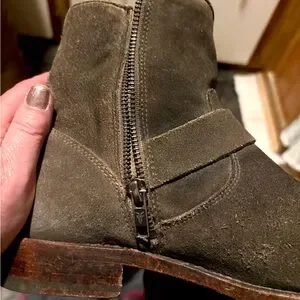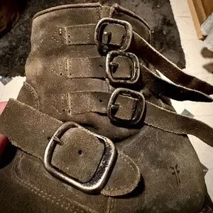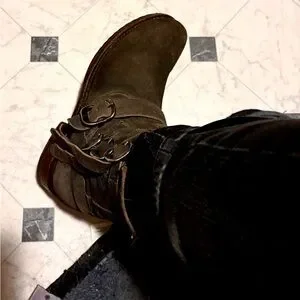 These beautiful distressed Frye Suede short boots are not only an eye catcher, but are rare find. I know they can probably be found, but I’ve never seen them! They are good used condition with the minor light scuffs and some light watermarks on the right boot. (Reflected in the reduced price). These boots are well built with excellent workmanship. They boast side zippers for easy on/off and three buckles with dangling fringe-like straps which work, but which mainly add to the boots, distressed western look. The sole are these boots is lugged and therefore pretty good on most surfaces. The one inch, stacked heel is also sturdy and protected. They fit well to the foot and are very comfortable. A true size 9 medium. Offers and questions welcomee!!