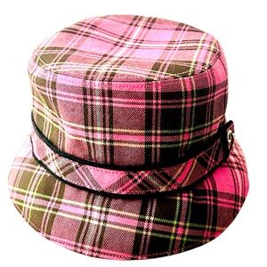 Plaid hat- predominant color pink with green, white and brown stripes.