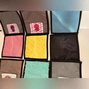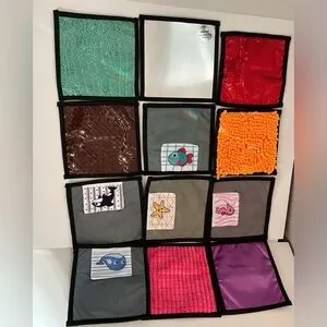 Set of 12 mini textured sensory mats. Different colors and textures to each mat. Out of original package - mats appear new without any use noted. See pictures for different textures and colors. Small and travel friendly. Also come with built hooks for hanging if desired.