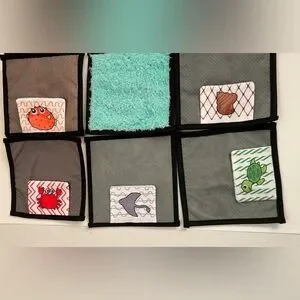 Each of the squares has one side with texture fabric. The other side has grey fabric with small raised dots with a small sized square of soft felt like material with an animal on it. The small square is attached on one side with the hook for attaching to something is underneath it. I have added some close up pictures of the side with animals to the listing.