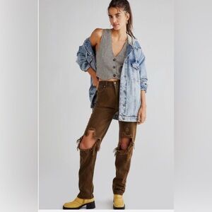 The Free People High Rise Lasso Jeans feature a vintage look, high-rise, straight-leg silhouette, distressing throughout, and button closure.