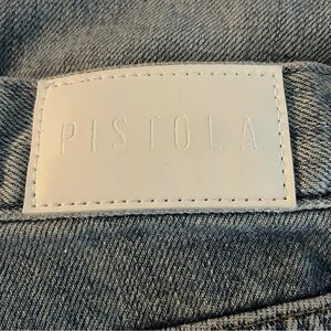 Keywords: Pistola, wide-leg jeans, size 30, blue denim, distressed, relaxed fit, women's jeans, medium ight wash, casual wear, comfortable, trendy, cotton, rayon, machine washable, pre-owned.